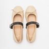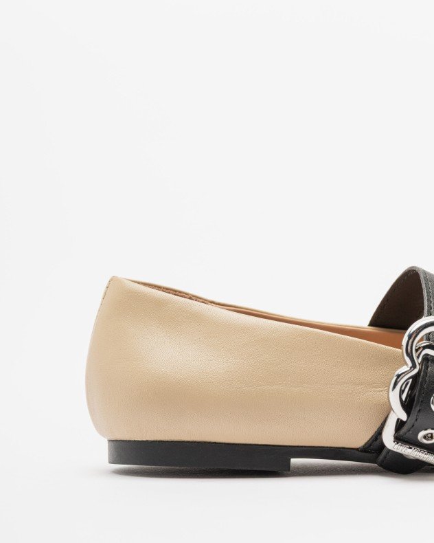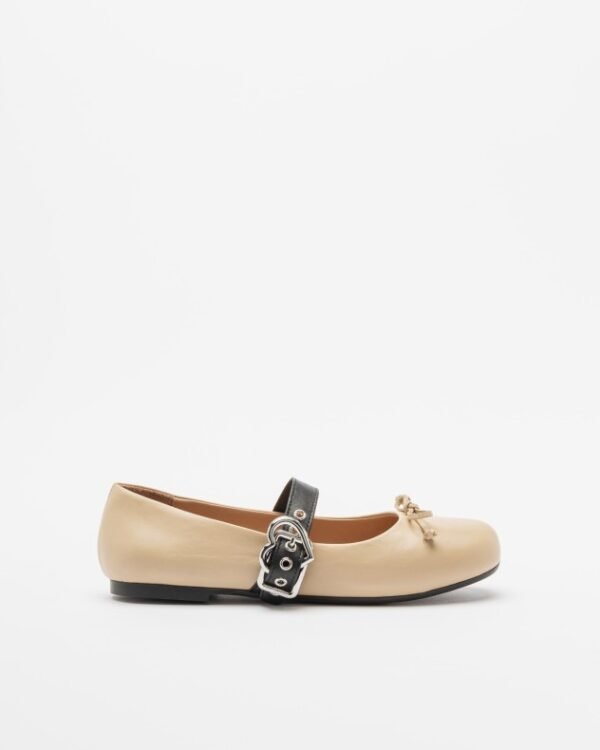 Beige leather ballet flats with a bow at the front. Contrasting strap at the top with an exclusive Love Moschino buckle.