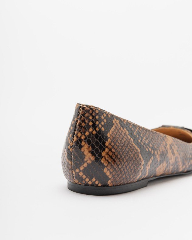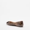Brown snakeskin ballet flats with a pointed toe. Front bow with Love Moschino logo.