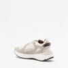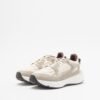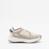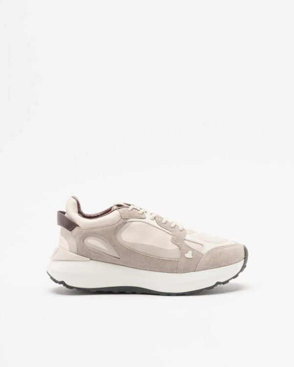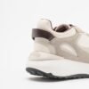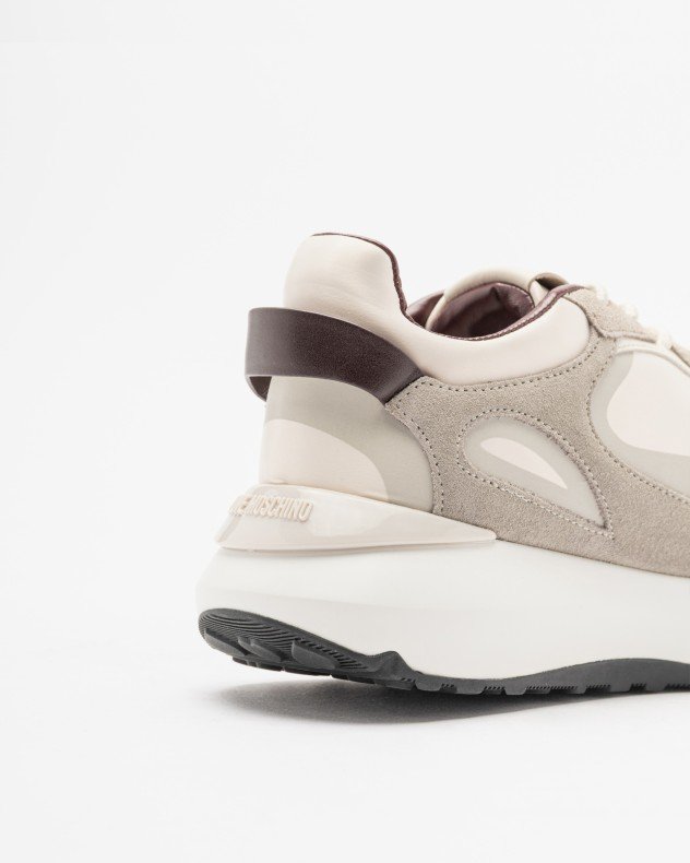 Beige sneakers in shiny fabric and suede with a chunky, high sole. Burgundy details and Love Moschino logo printed on the tongue.