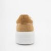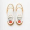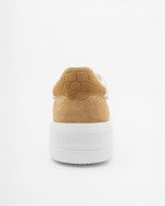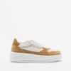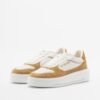 White leather sneakers with camel suede inserts and Love Moschino logo printed on the side.