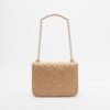 Love Moschino bag in beige faux leather with quilted design, stitched details and gold Love Moschino logo.