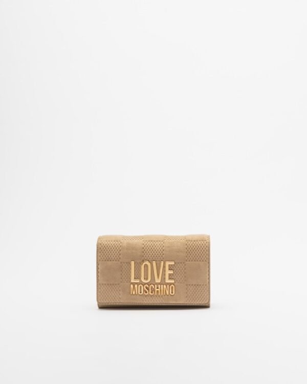 Love Moschino beige crossbody bag made of faux leather and suede. Highlighted by the gold Love Moschino logo on the front.
