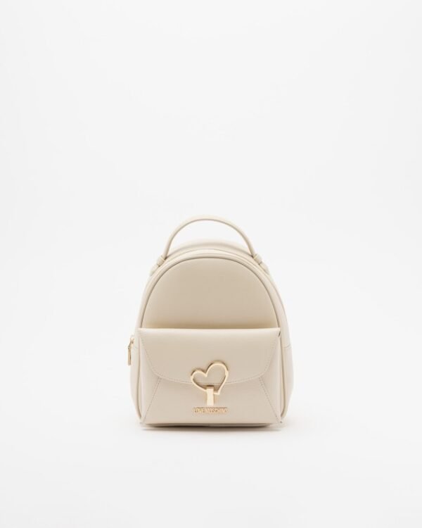 Black faux leather backpack by Love Moschino. Outer pocket with metallic logo and snap closure.