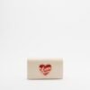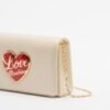 Beige clutch in faux leather with a shiny finish. Red heart-shaped appliqué featuring the Love Moschino logo.