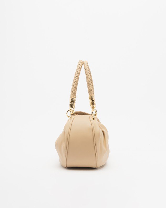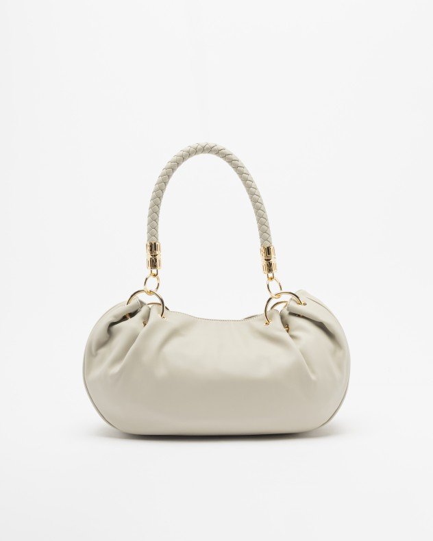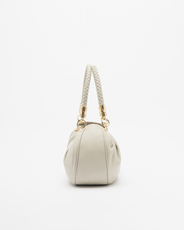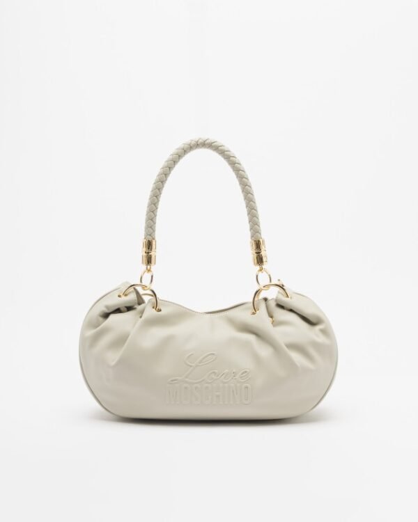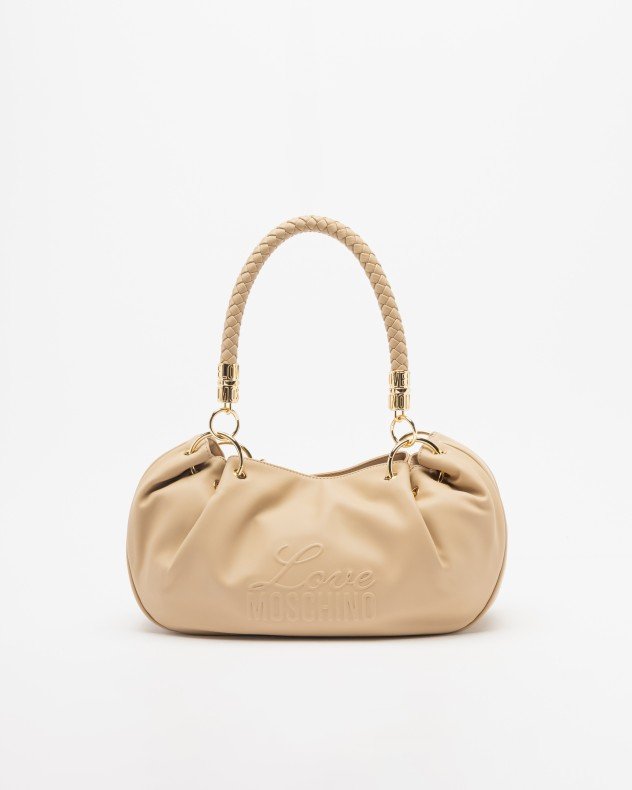 Love Moschino taupe shoulder bag with metallic details, interwoven shoulder straps and embossed brand logo.