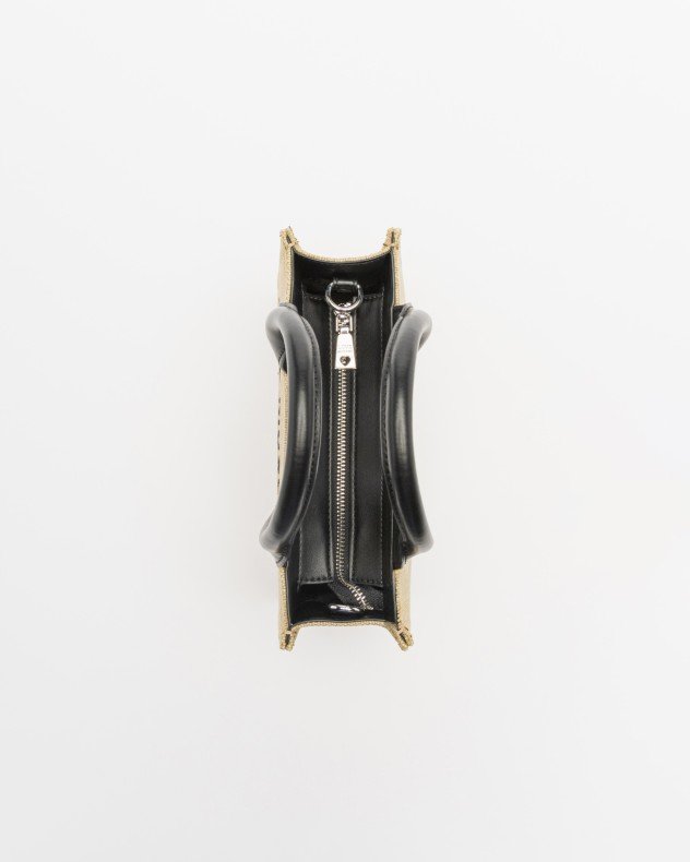 Love Moschino tote bag in canvas fabric with black faux leather details. Features contrasting embroidered Love Moschino lettering and branding.