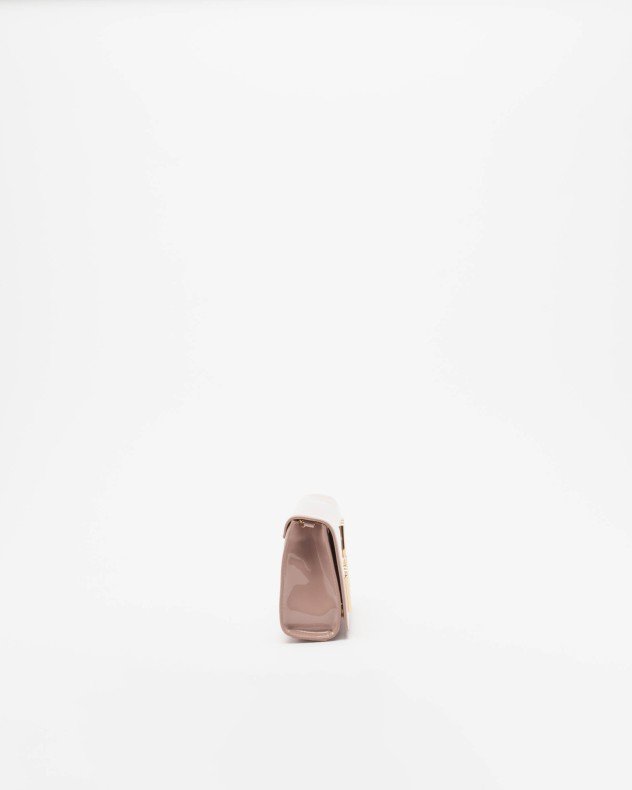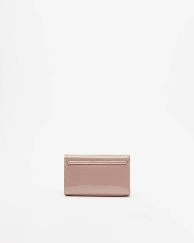 Love Moschino pink crossbody bag in faux leather with a glossy patent finish. Gold-tone metal Love Moschino logo.