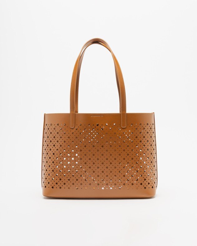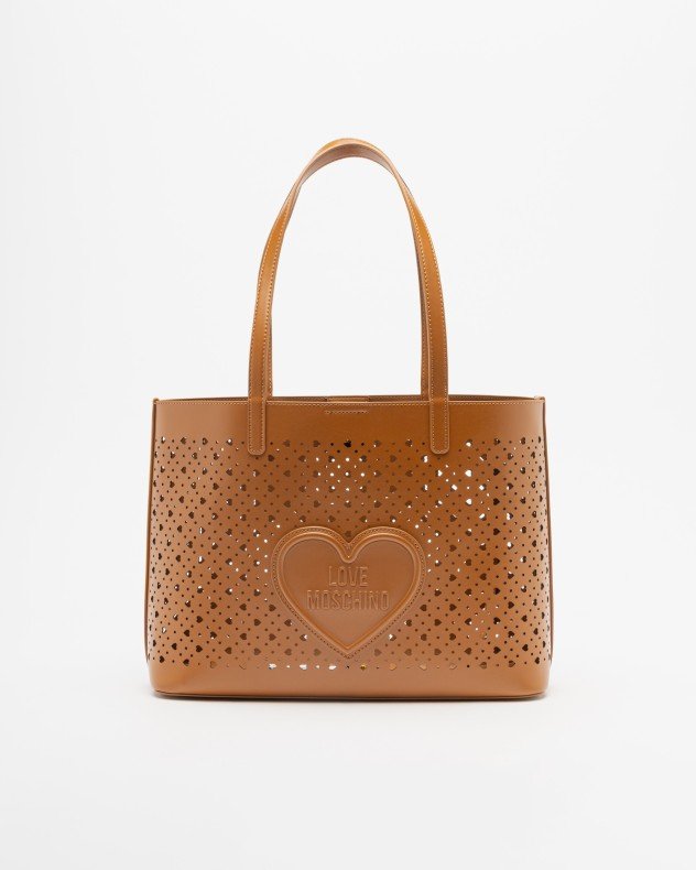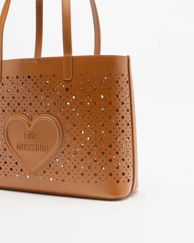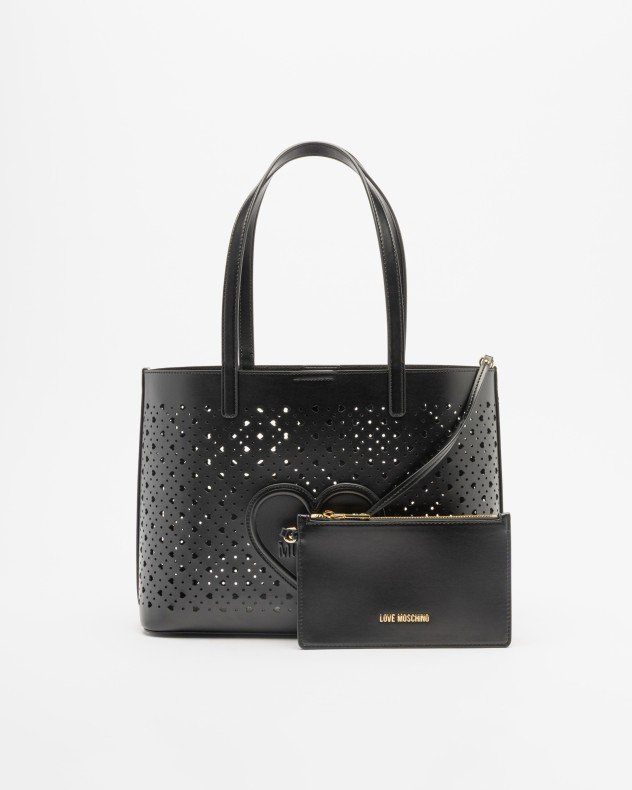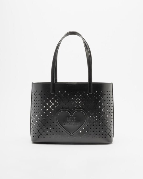 Love Moschino black tote bag in smooth synthetic leather with a supple structure and heart-shaped perforations. Embossed Love Moschino logo detail.
