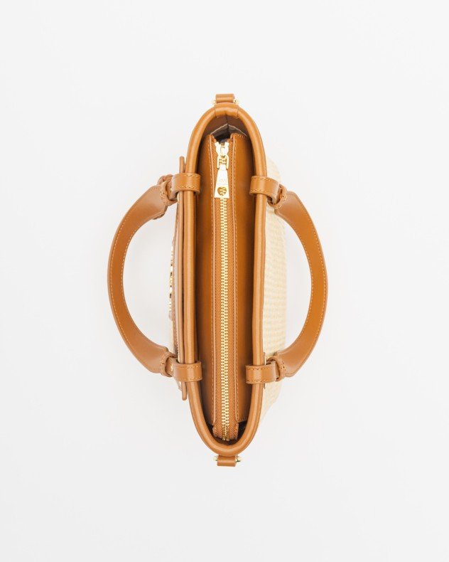 Love Moschino tote bag in raffia with camel faux leather details. Small pocket detail on the front with gold Love Moschino logo.