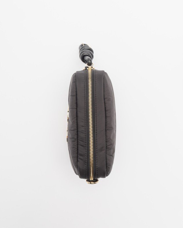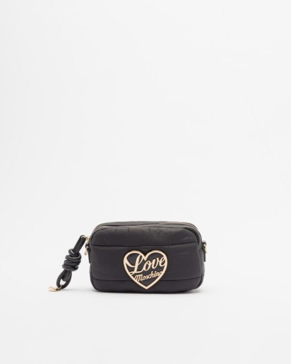 Black Love Moschino crossbody bag made of quilted polyester fabric. Heart-shaped metal plate detail with Love Moschino lettering.