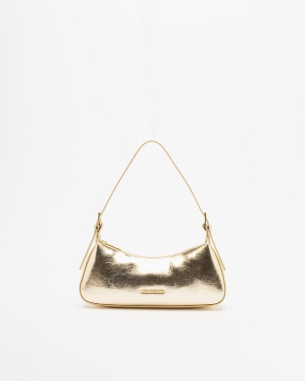 Love Moschino golden baguette bag in smooth faux leather with cracked effect. Features a gold Love Moschino logo detail in 3D.