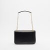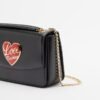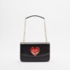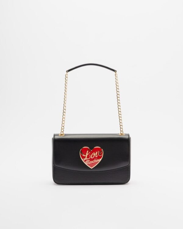 Black bag in soft faux leather with a gold chain strap. Red heart-shaped appliqué with the Love Moschino logo.