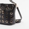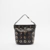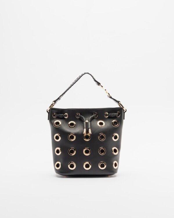 Black bucket bag with circular gold eyelets. Adjustable closure with braided drawstring and top handle with metal details.