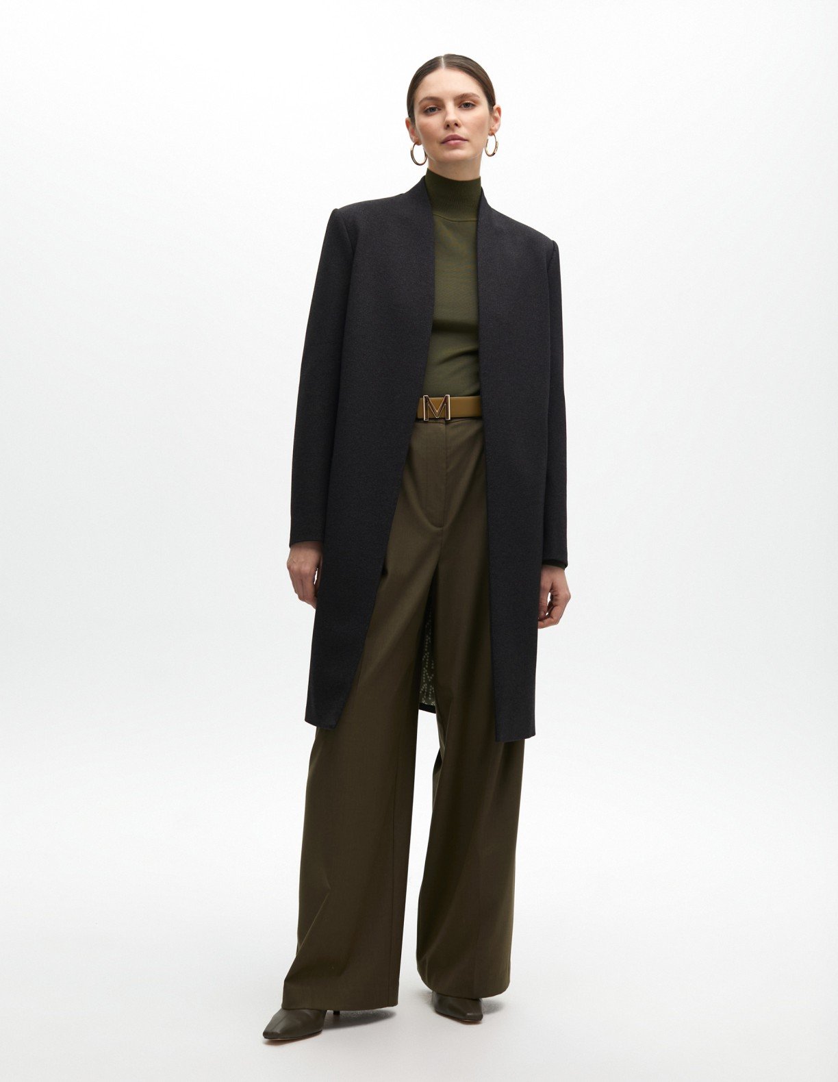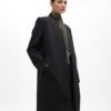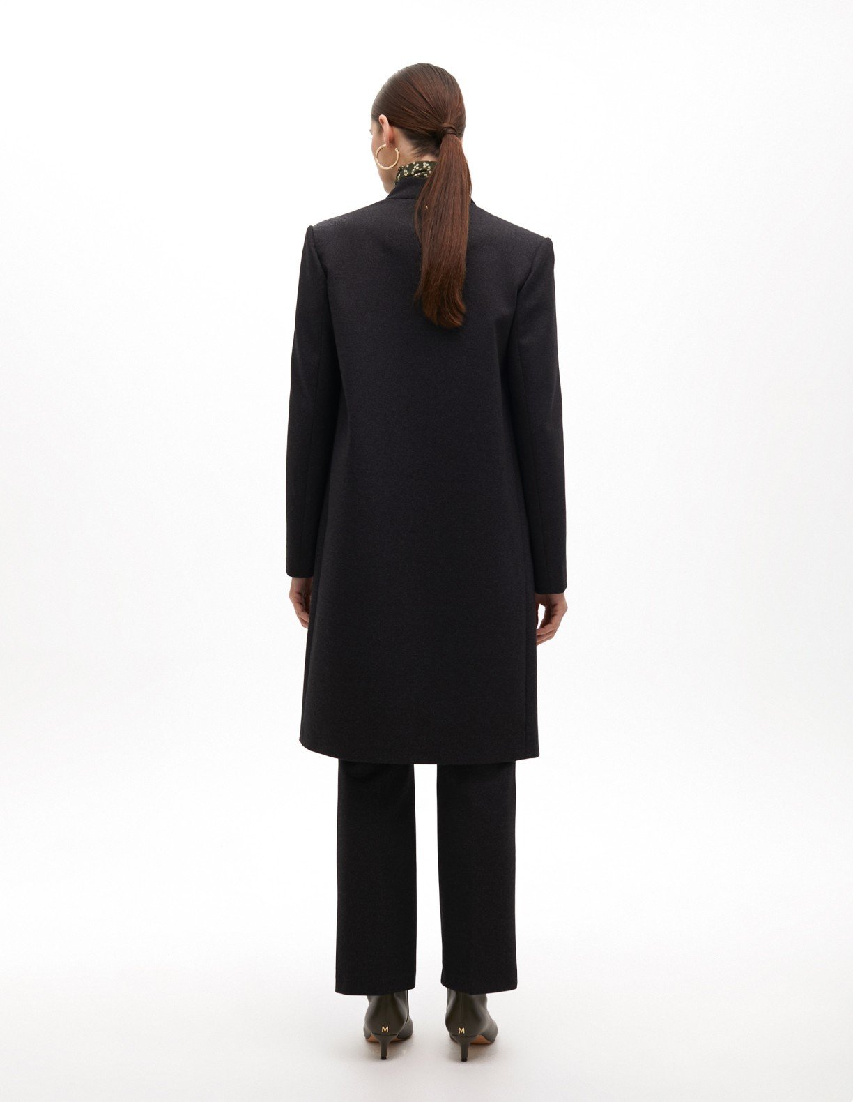 Long gray coat with gold details. Green lining with exclusive Maite print.
