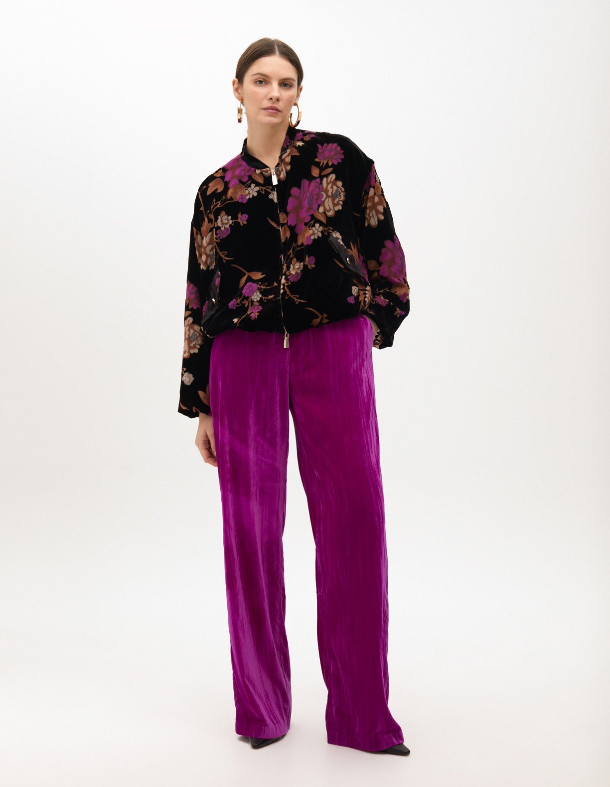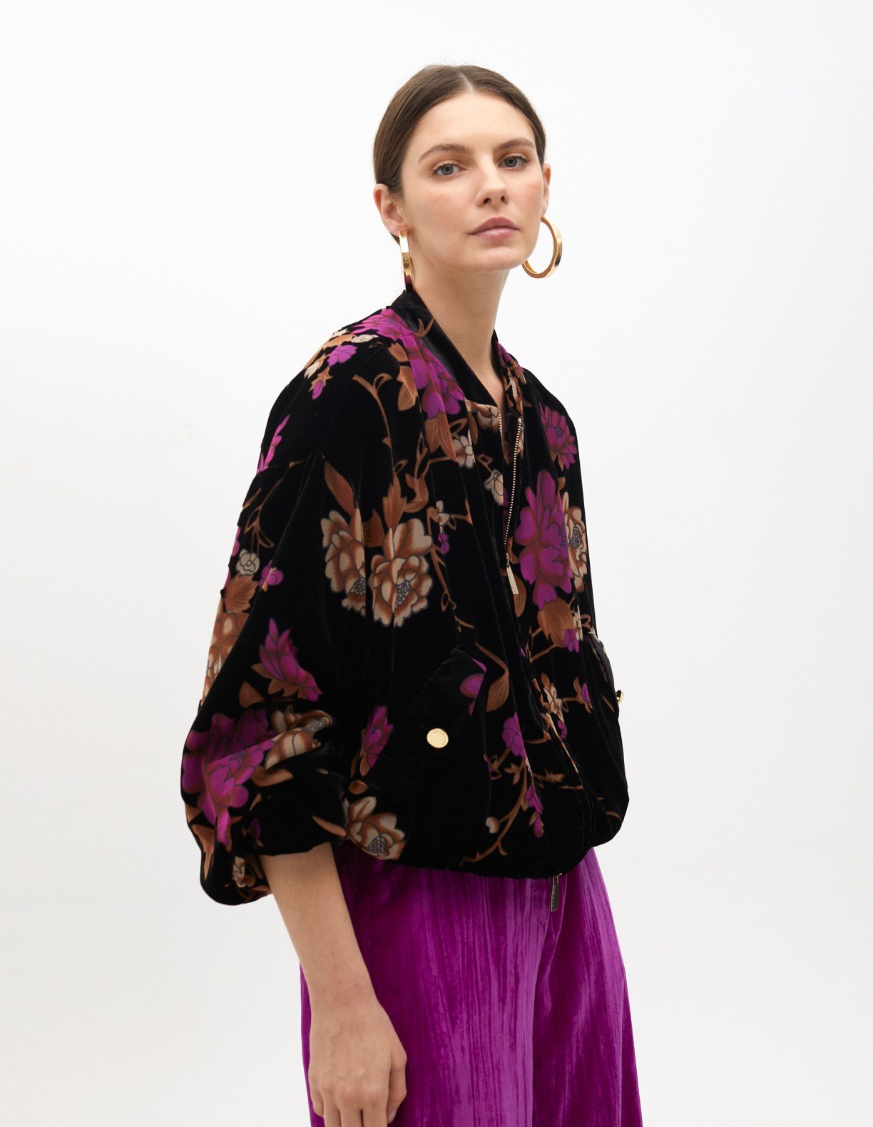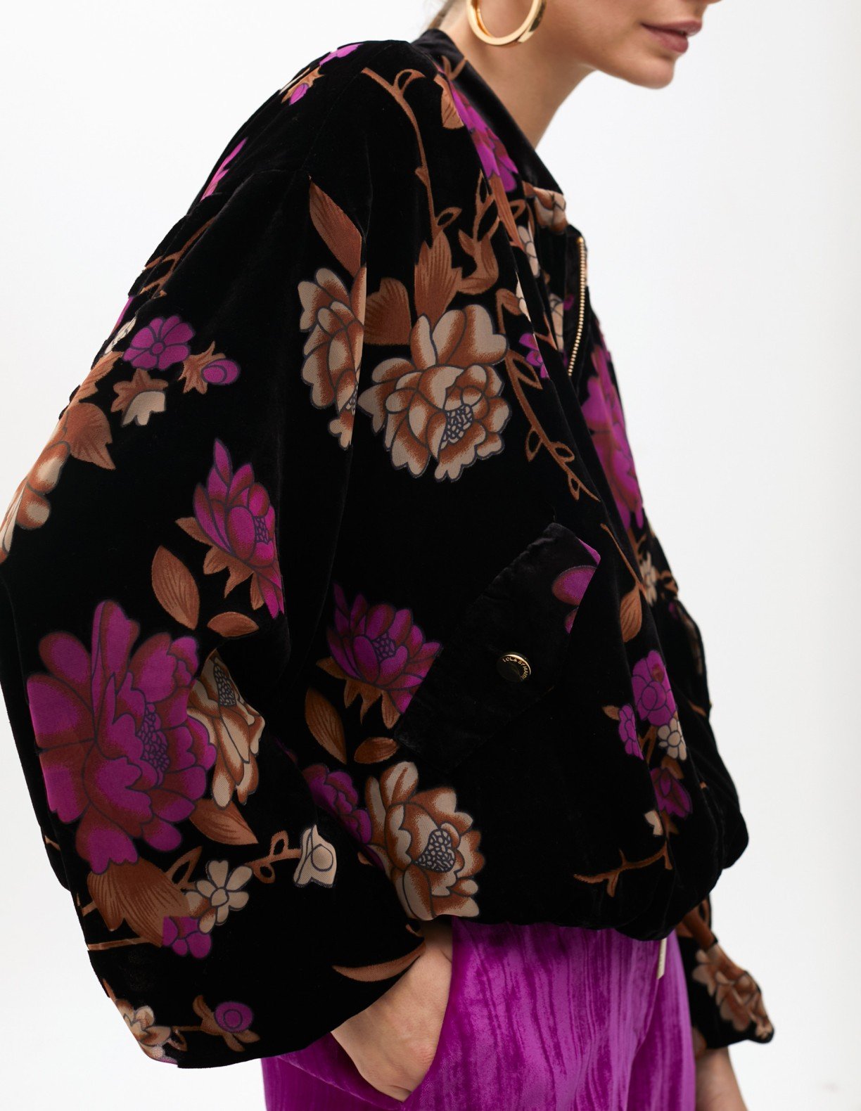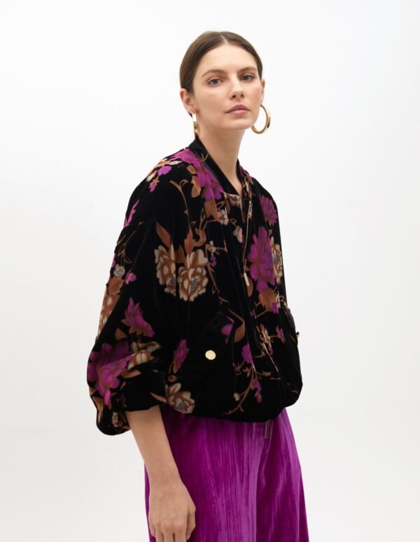 Multicolored bomber jacket in jacquard fabric with a floral pattern. Zipper closure and stand-up collar.