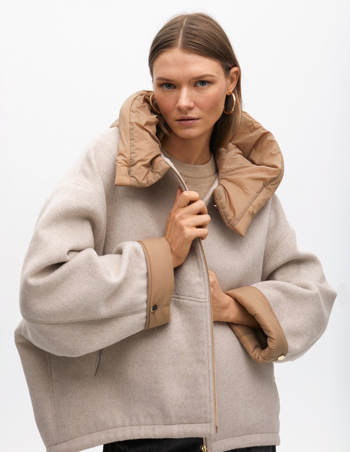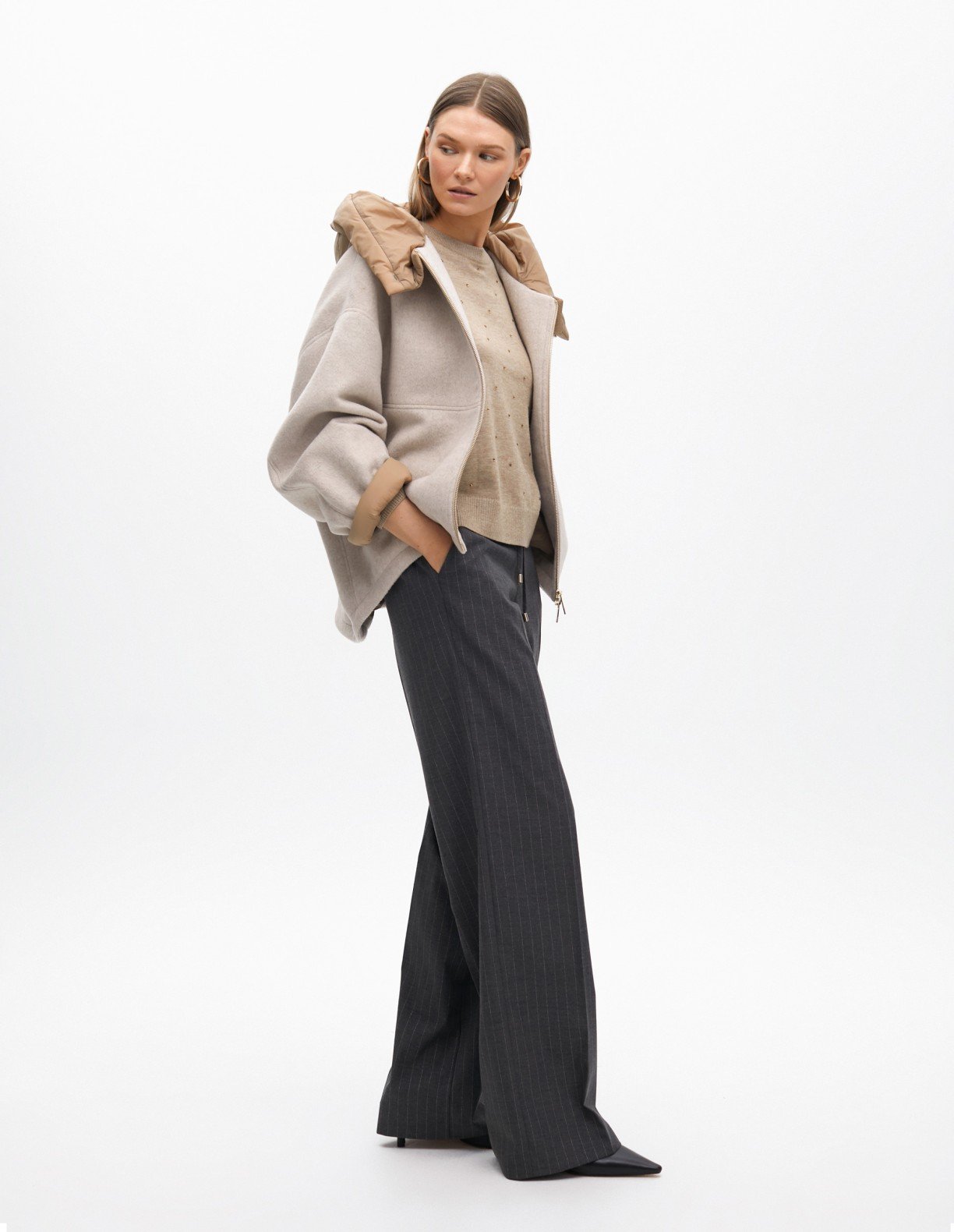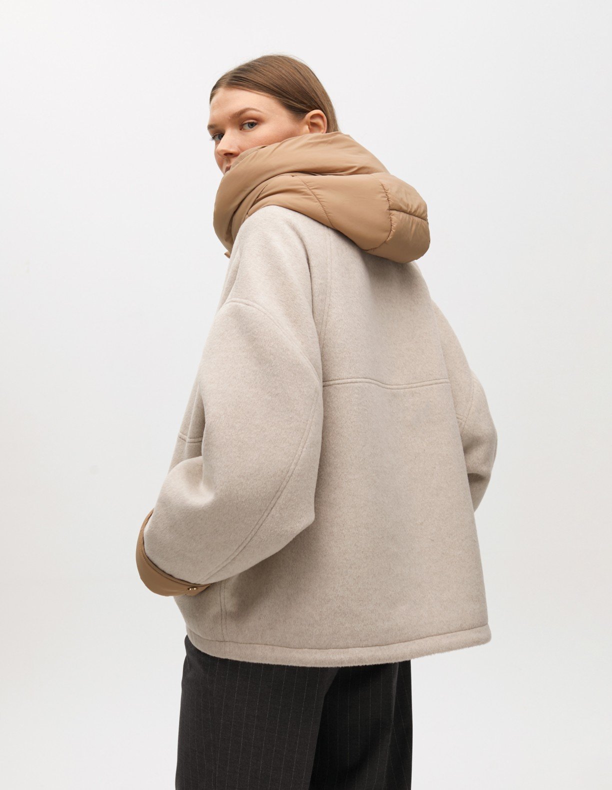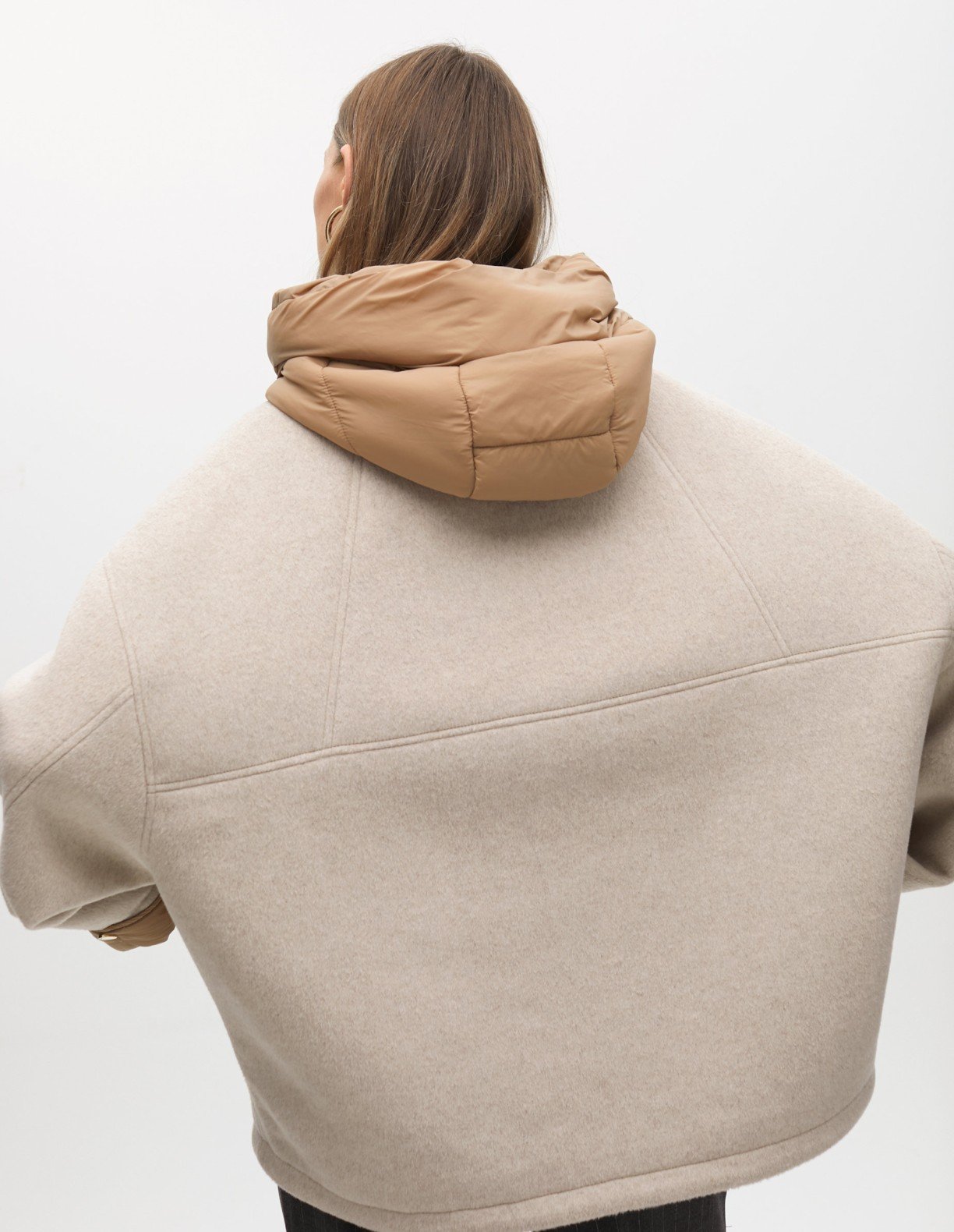 Beige coat with hood and nylon lining. Gold button closure and metallic Maite detail on the front.