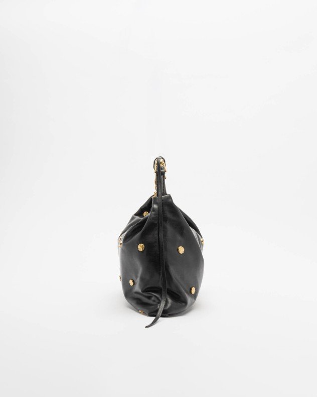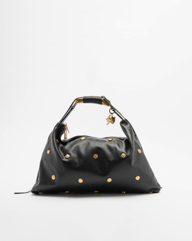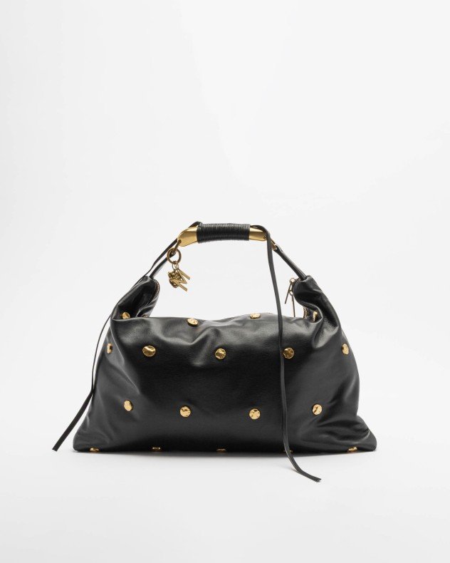 Maite by Lola Casademunt black shoulder bag in synthetic leather with gold stud details and metal branding pendants.