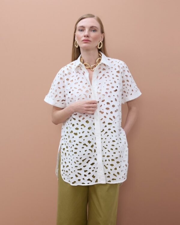 Long white shirt with an irregular open design. Designed with short sleeves, a pointed collar and button fastening at the front.