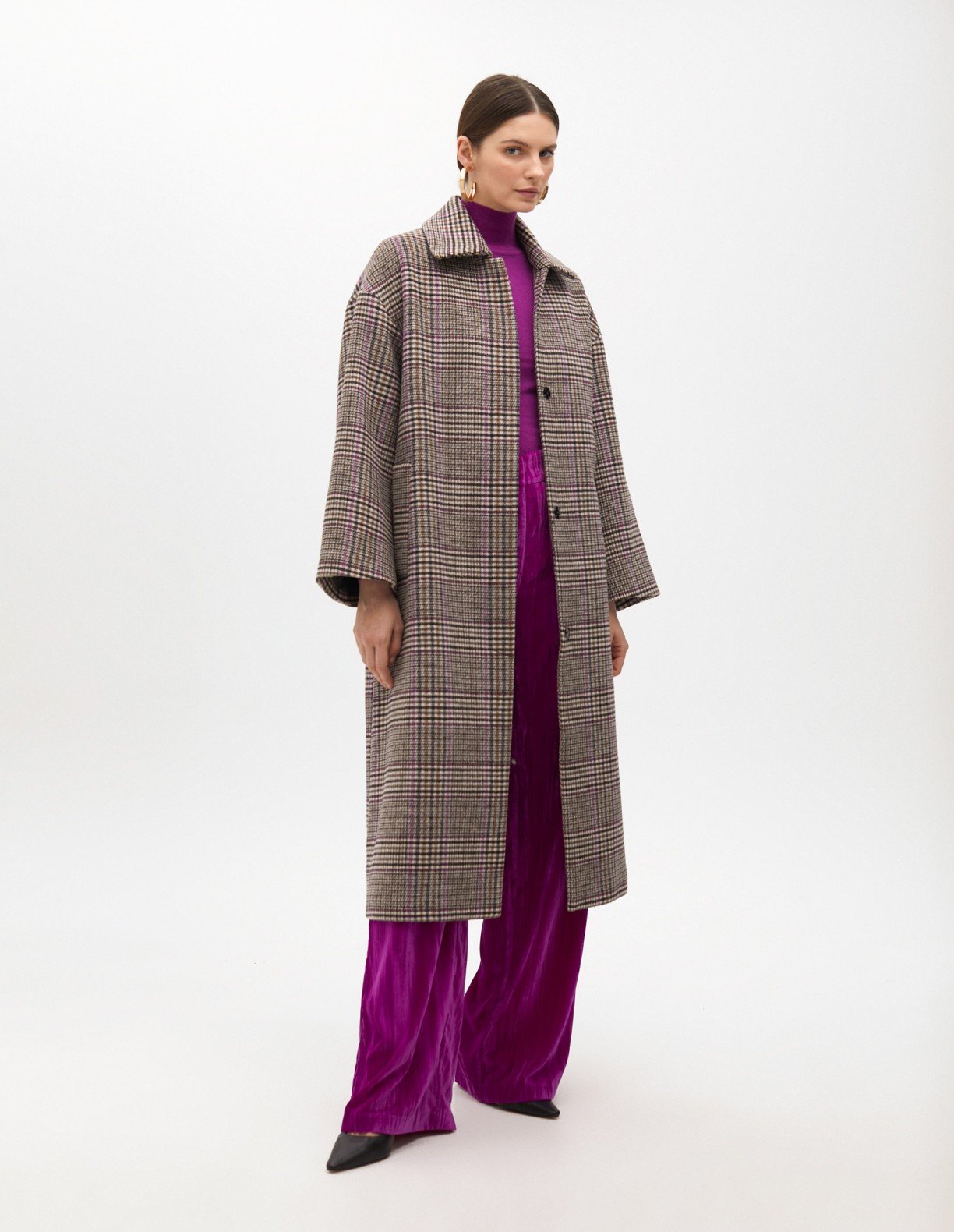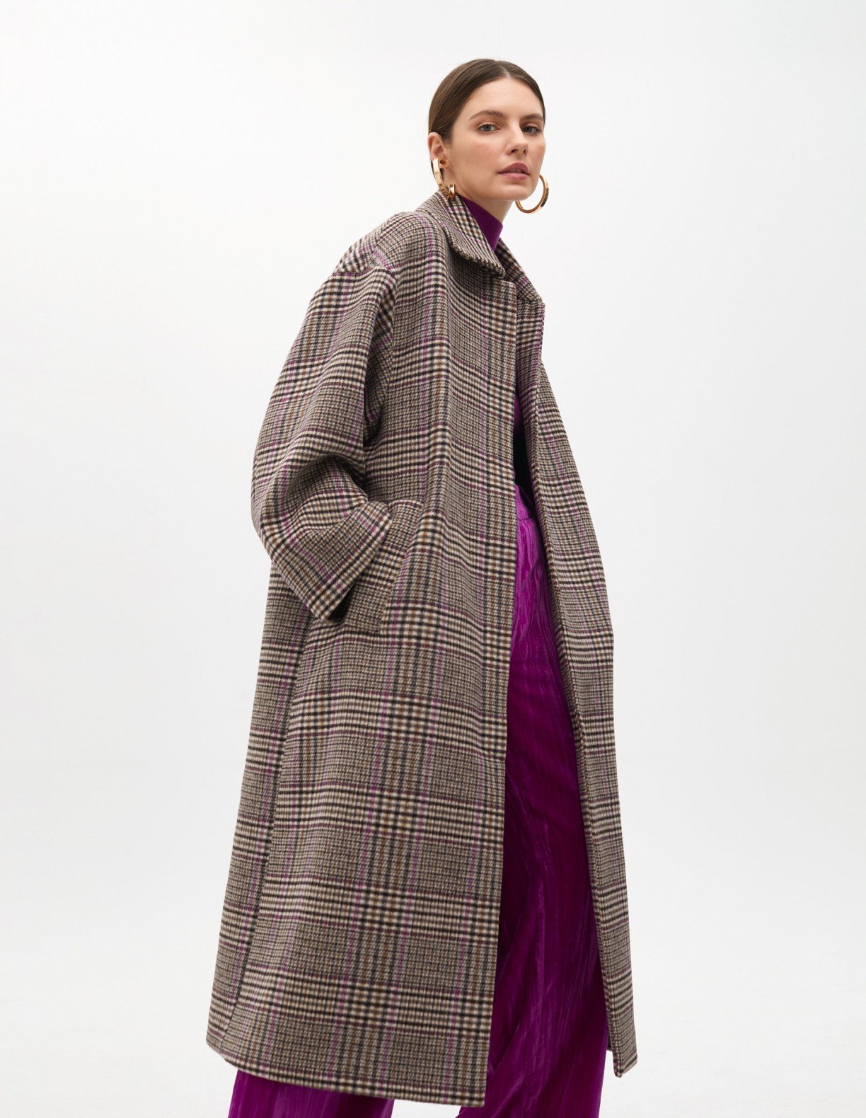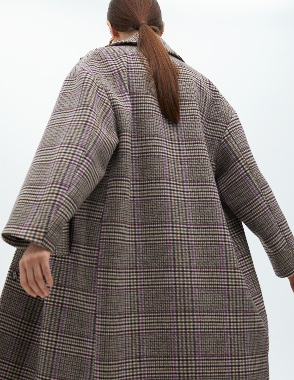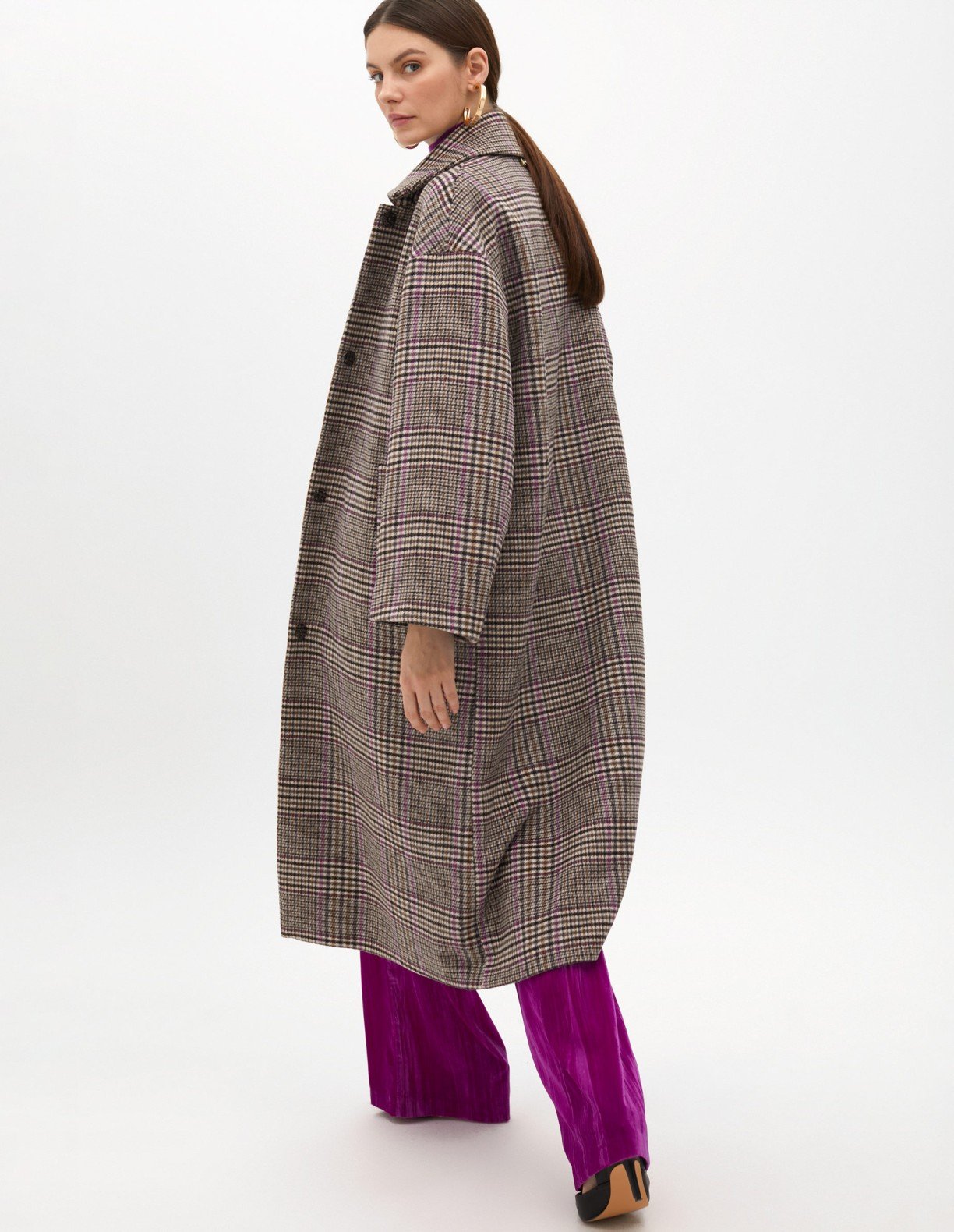 Beige overcoat with a contrasting plaid pattern. Classic collar and snap-button closure at the front.