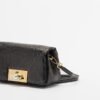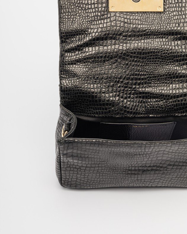 Black bag in shiny crocodile leather. Removable shoulder strap and metallic detail on the front with appliqués.