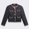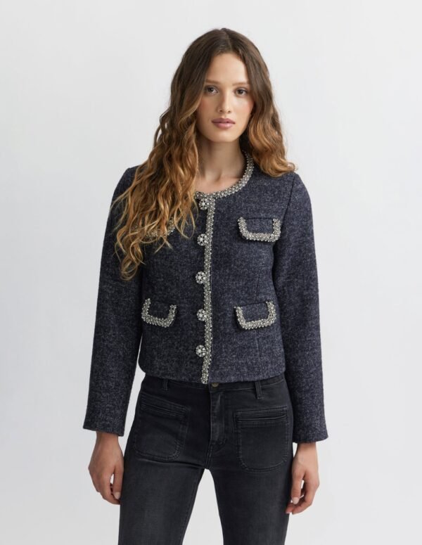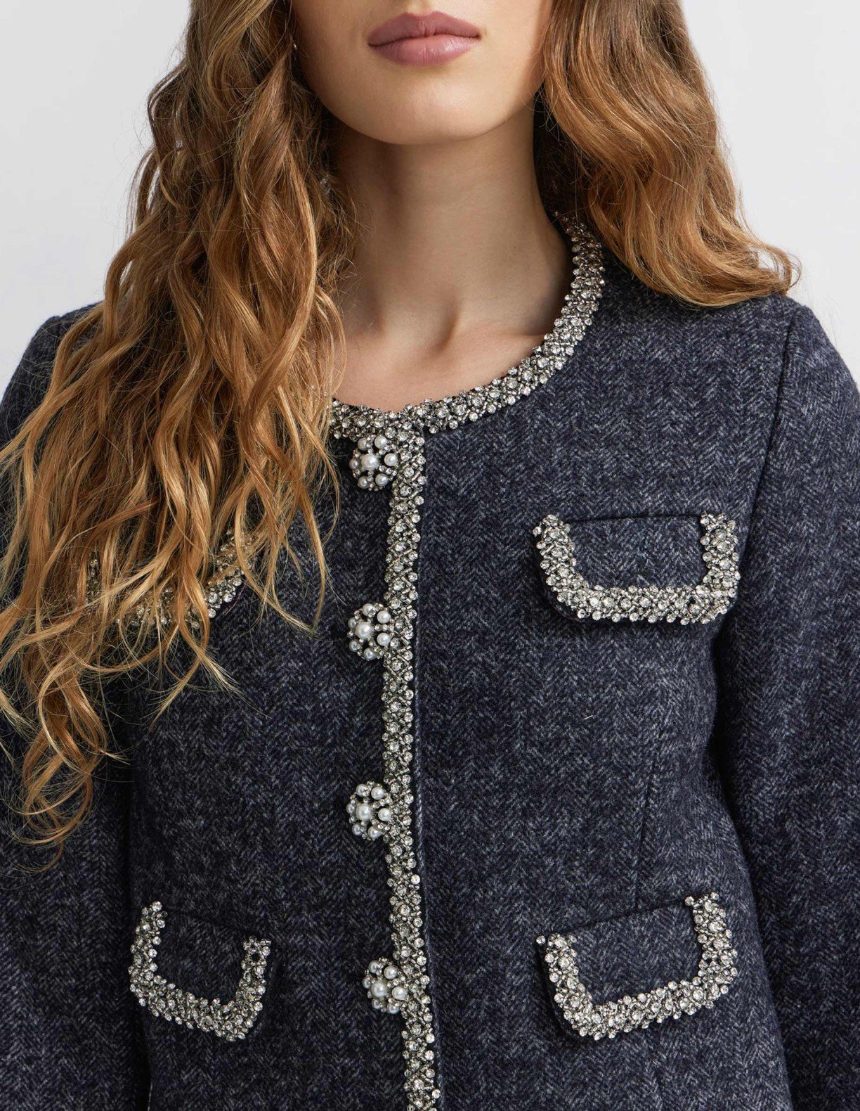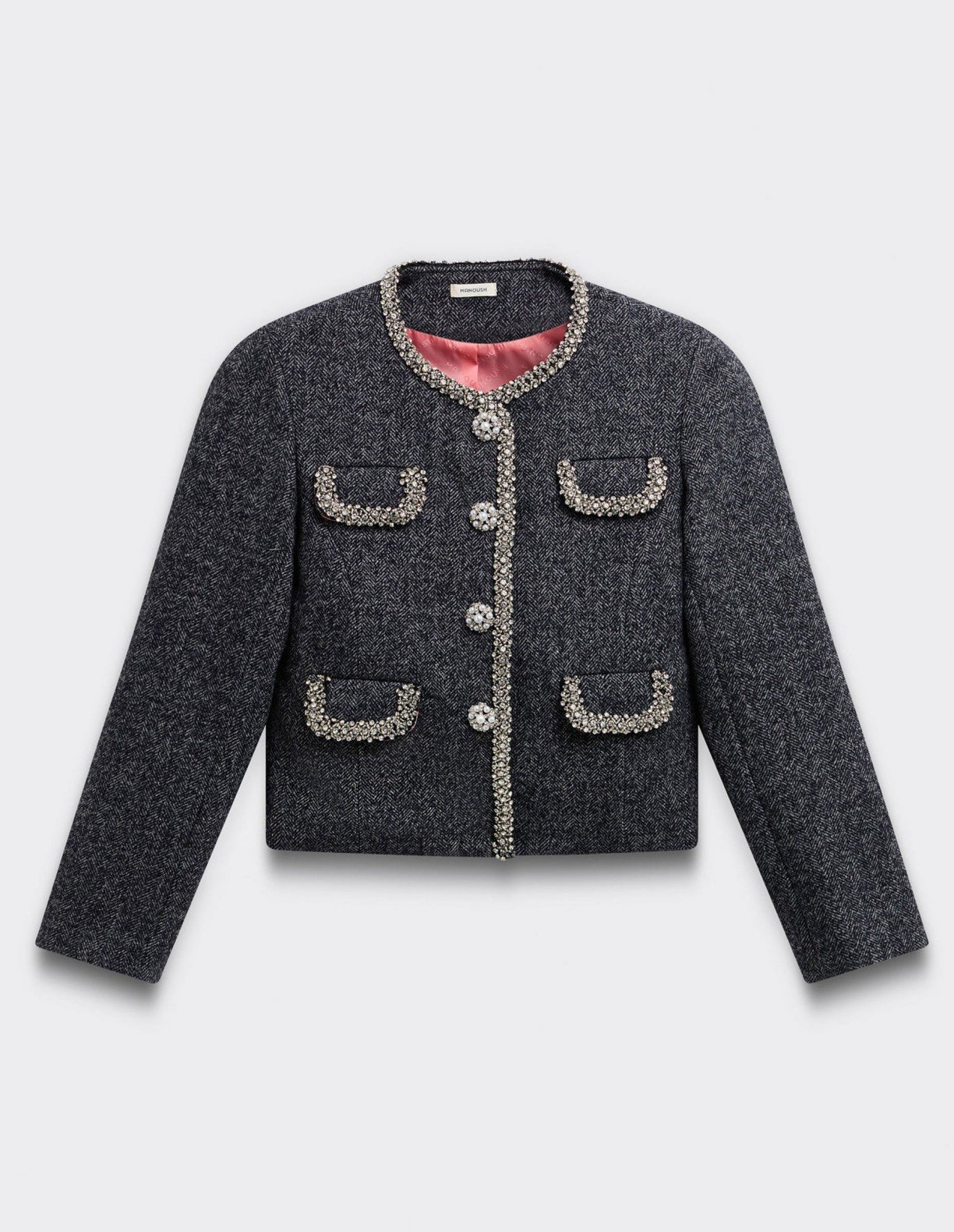 This gray Manoush chevron coat features delicate rhinestone jewel embellishments that add refinement and sparkle to the sleek, structured cut.