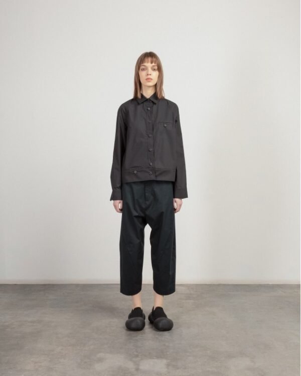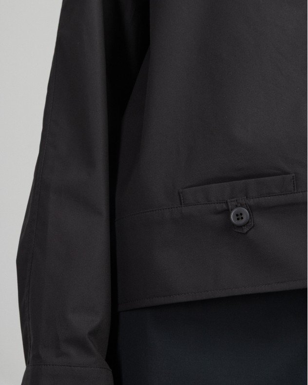 Long-sleeved black shirt with a multi-button design.