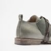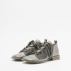 Gray leather shoes with a slightly square toe and laces tied around the shoe.
