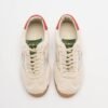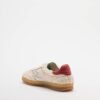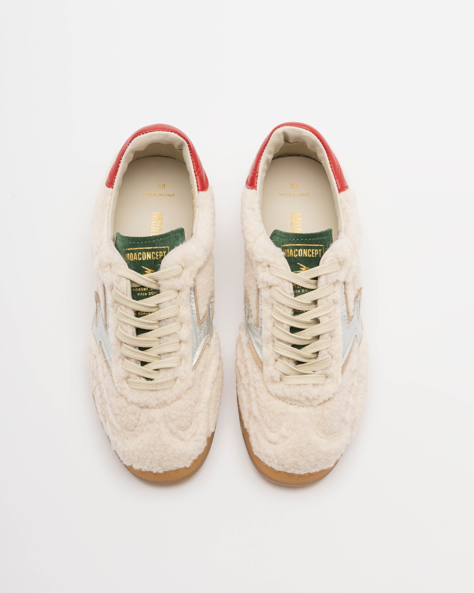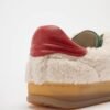 White low-top sneakers in plush fabric, with a red tab on the heel and a silver leather logo.