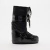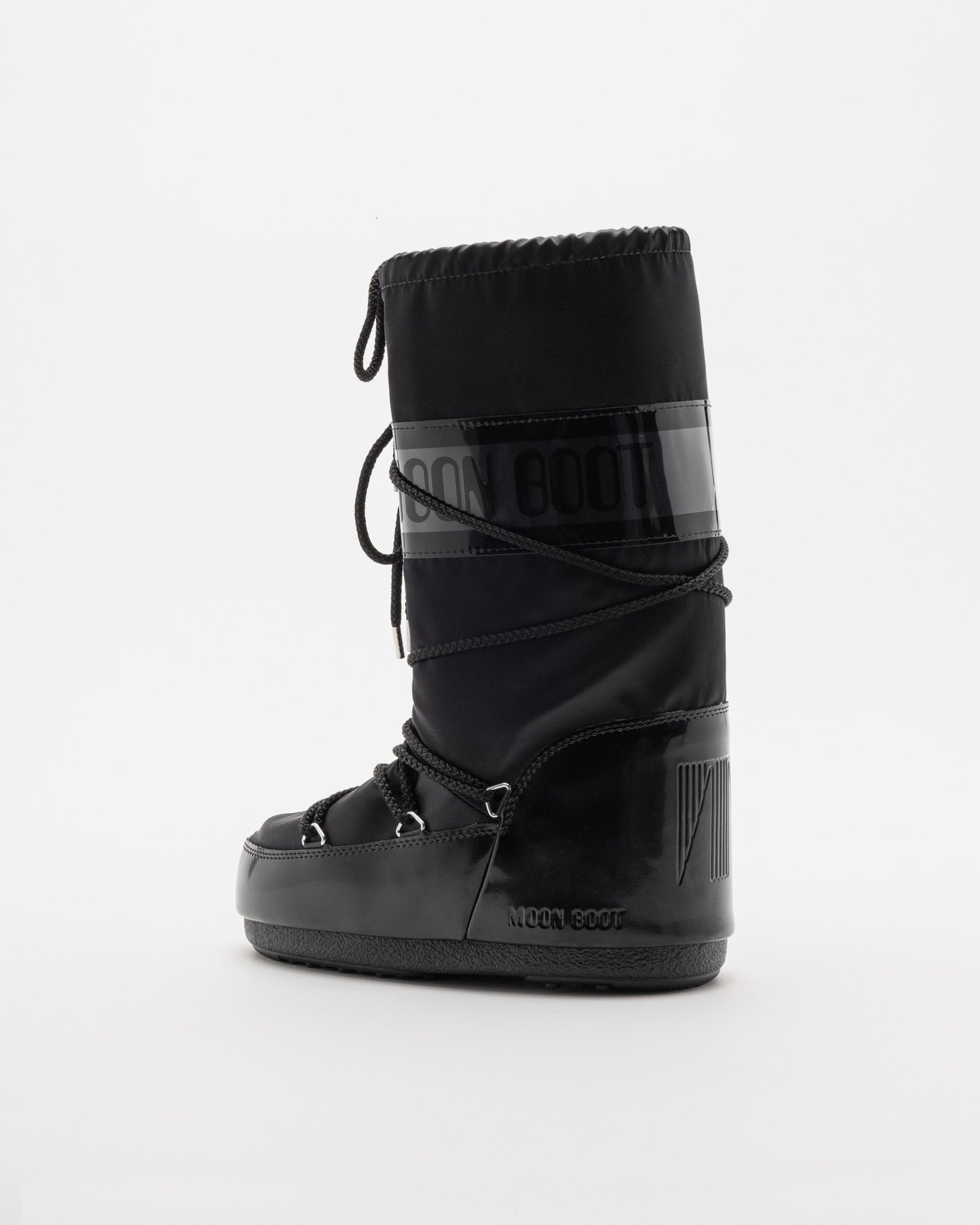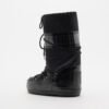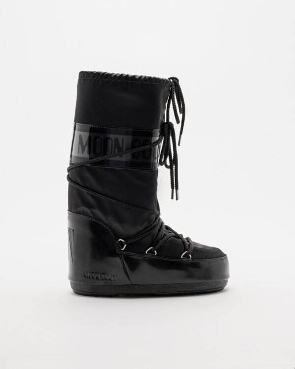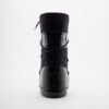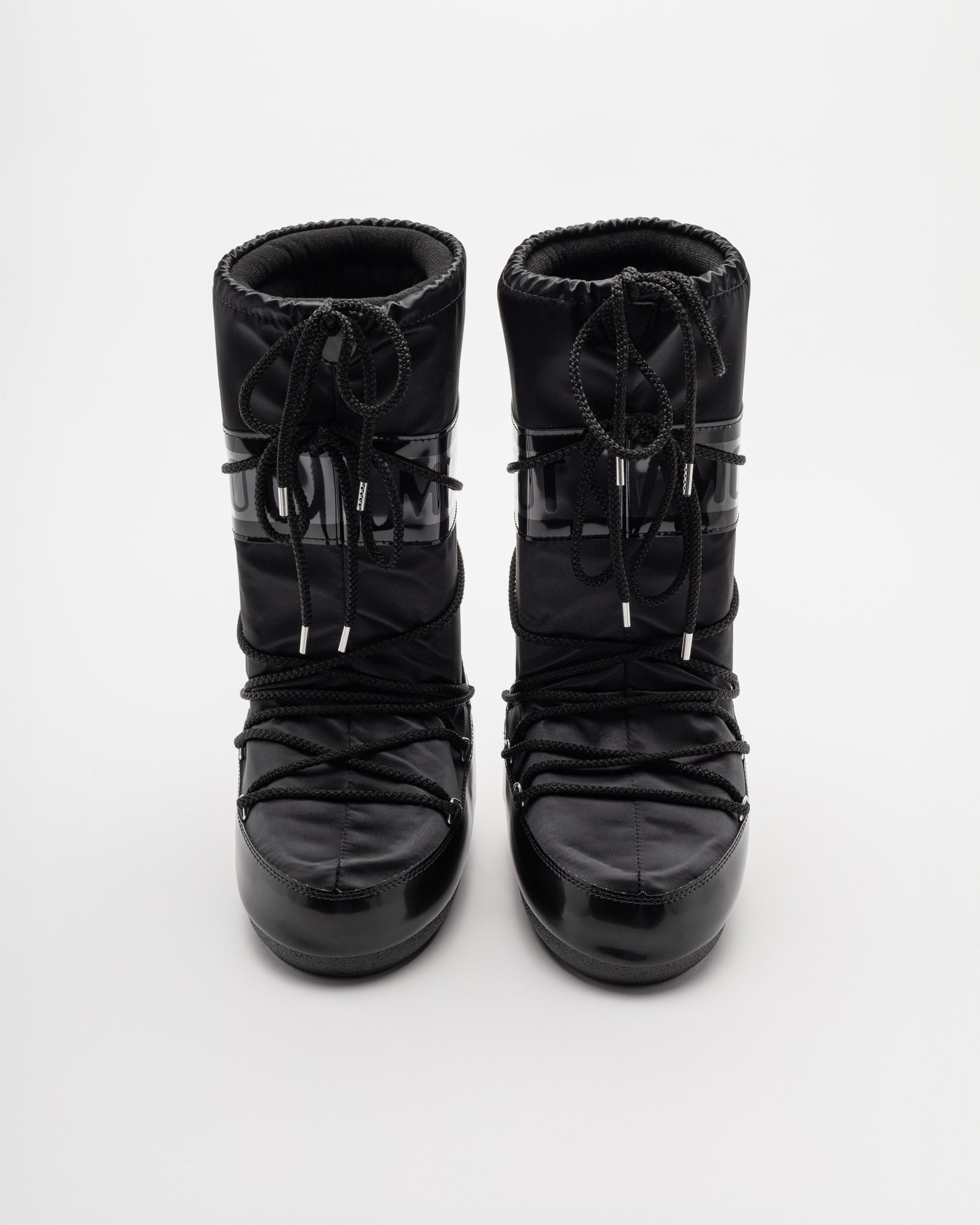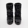 Black satin boots, 100% water-repellent, with Moon Boot logo panel. Lightweight rubber sole with suction cups.