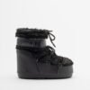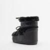 Black Moon Boot boots with a soft synthetic fur upper. They feature insulation, a lightweight sole, and rubber suction cups.