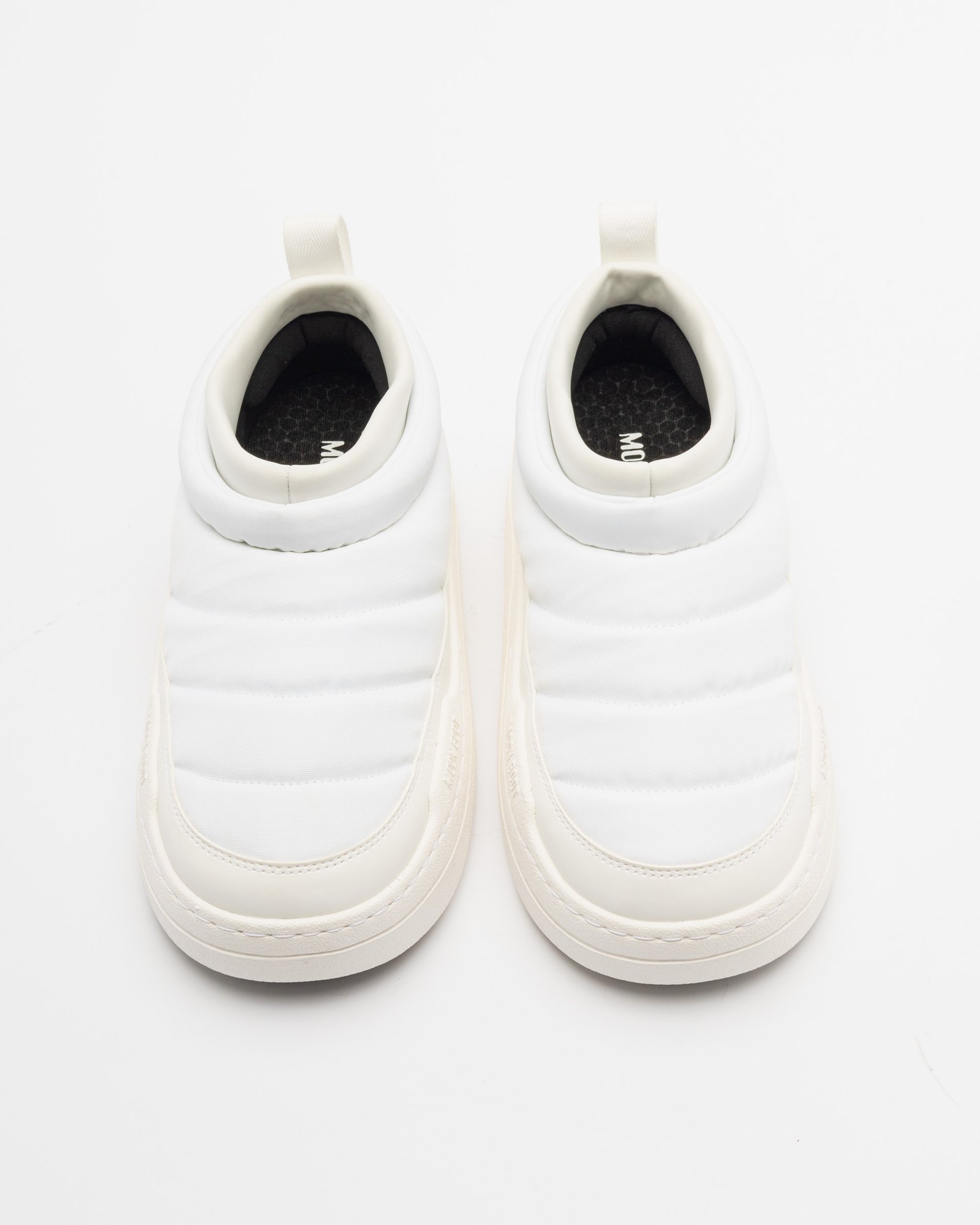 White sneakers in quilted nylon fabric. Platform sole and Moon Boot logo embossed on the side.