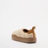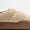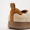 Beige slip-on sneakers with padded synthetic fur lining. Platform sole and camel suede detail on the heel.