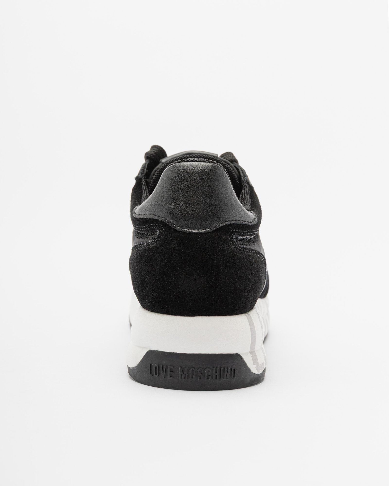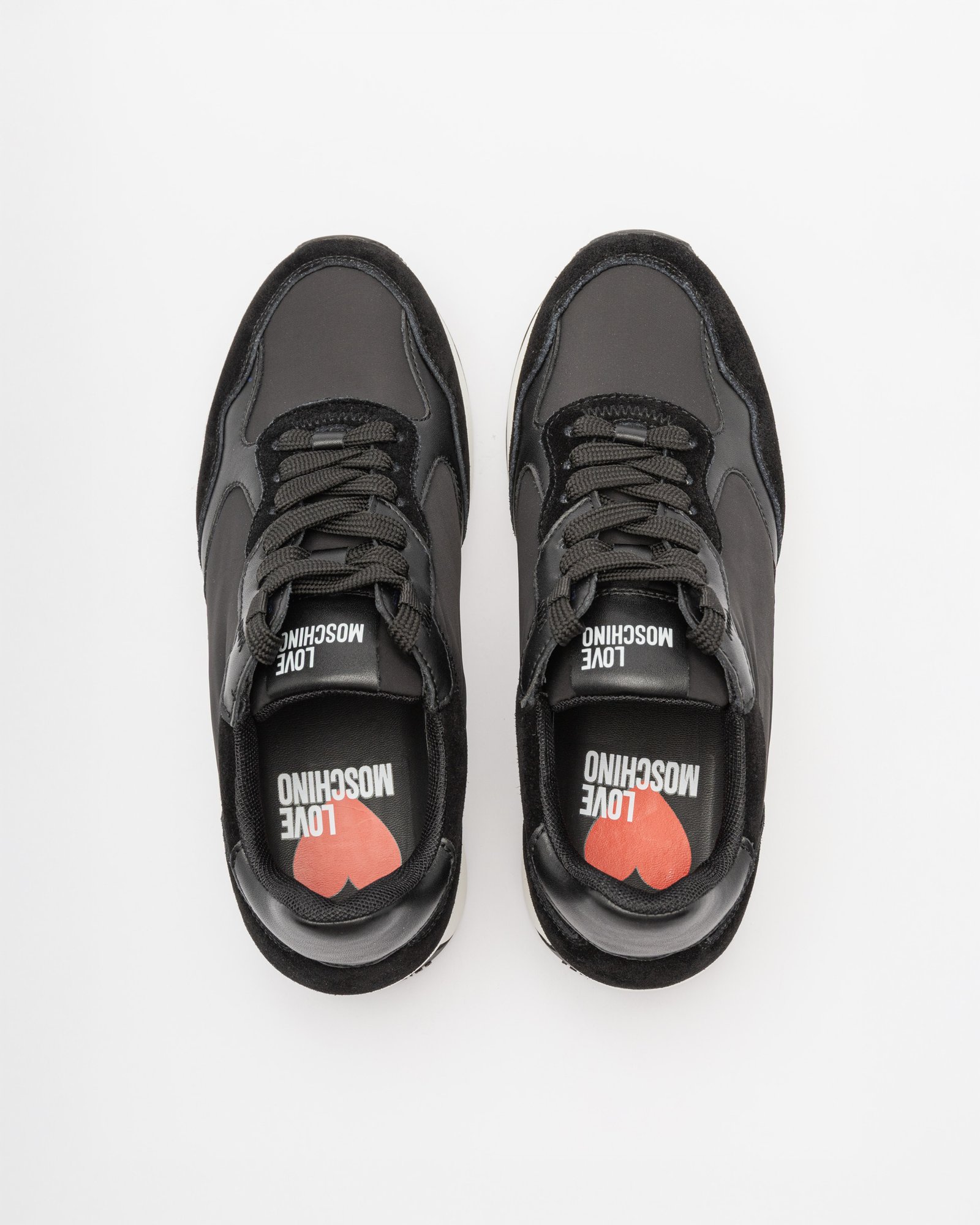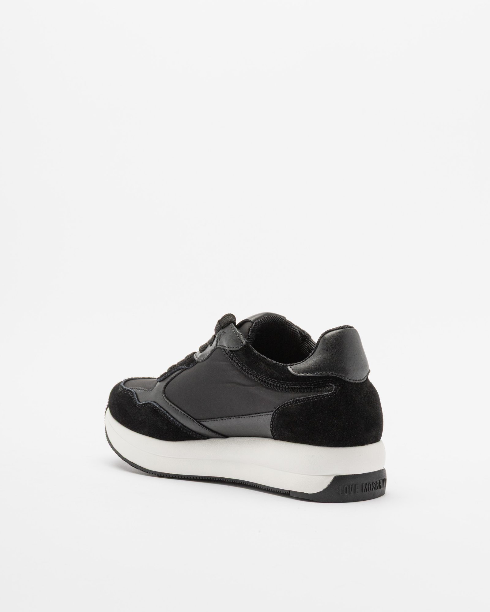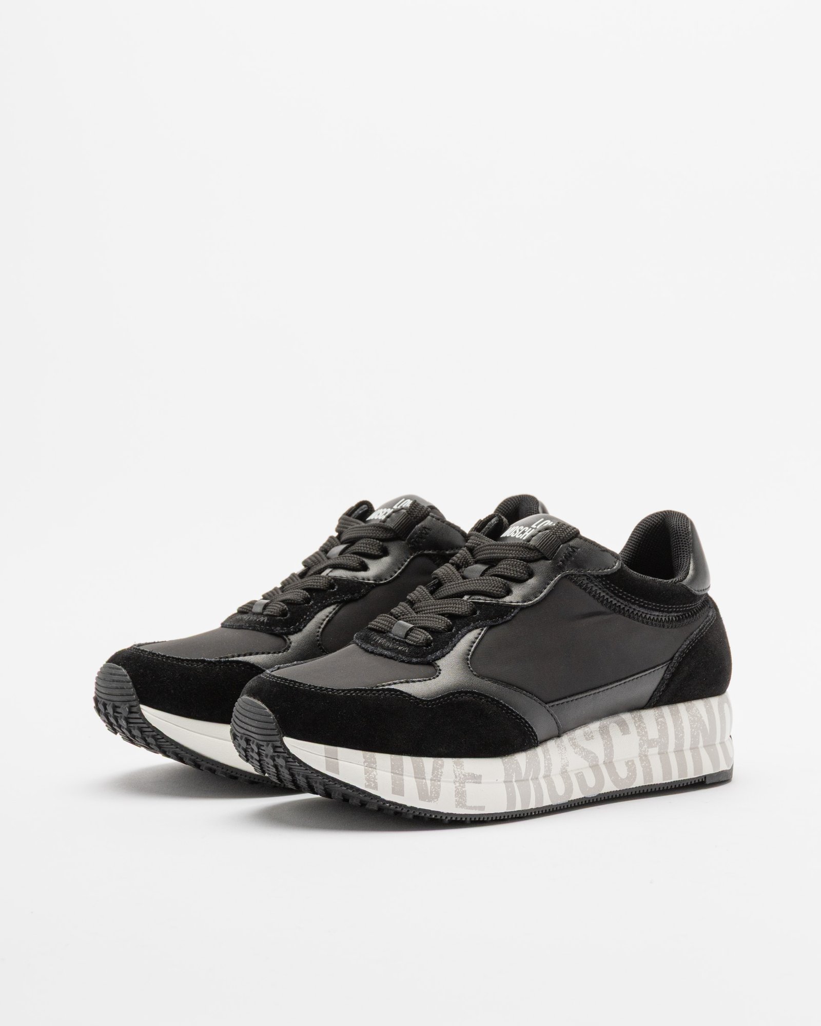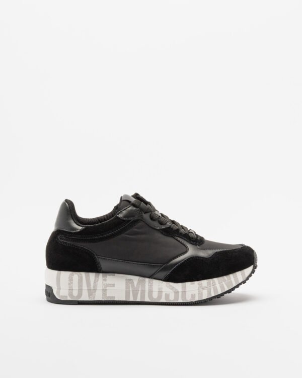 Black sneakers constructed from nylon, leather, and suede. High sole with printed Love Moschino logo.
