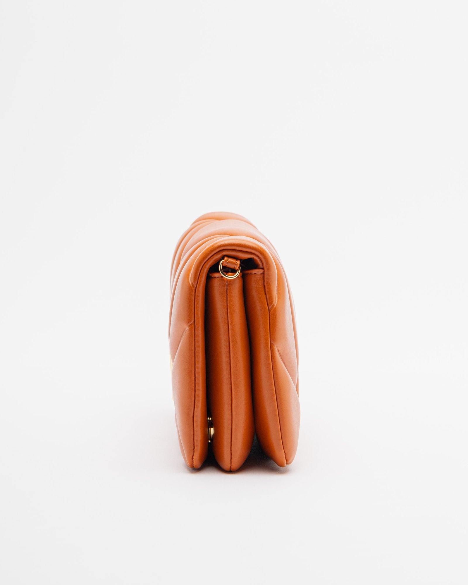 Orange Love Moschino bag with quilted design. Optional chain strap and gold metallic logo on the front.