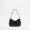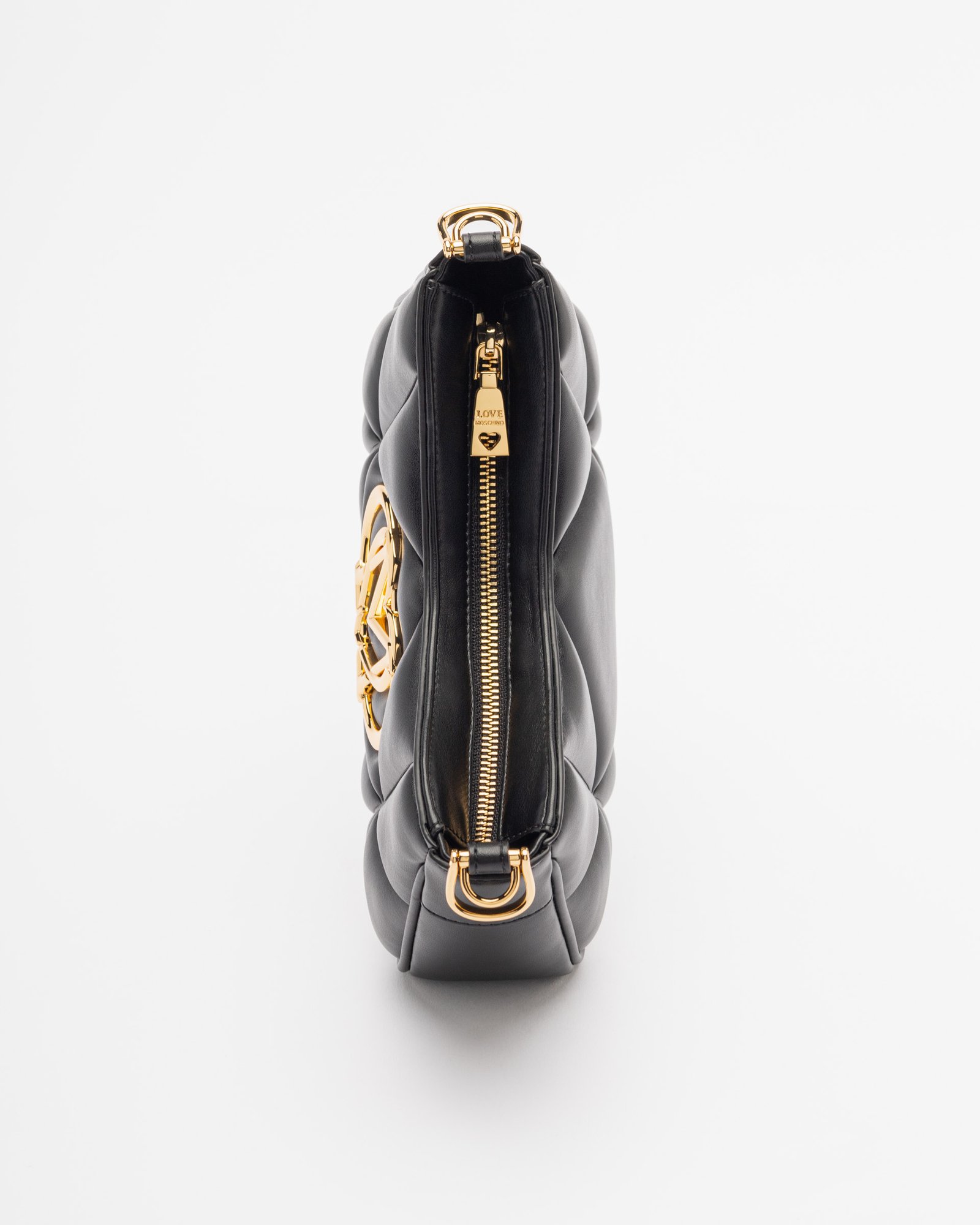 Black faux leather bag with a quilted effect and removable handle. Gold Love Moschino logo on the front.