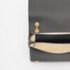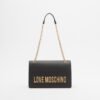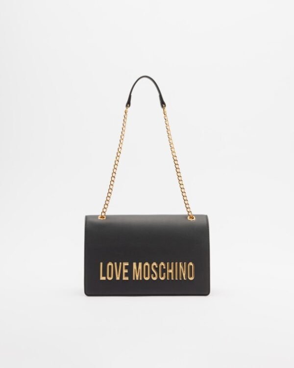 Black faux leather bag by Love Moschino. Chain strap and gold metallic logo on the front.