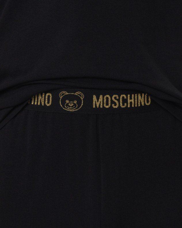 Set of men’s pajamas by Moschino Underwear. A5001 features of a pack of black sweatshirt and pants with golden branding details.