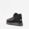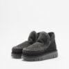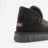 Black ankle boots with platform sole and genuine fur lining. Suede upper with crocheted Mou label detail on the heel.