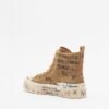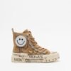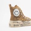 Camel-colored high-top sneakers with a distressed design and hand-painted details. Platform sole and suede upper with sparkling smiley face appliqués.