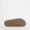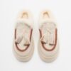 Beige suede platform flip-flops with soft fur lining. Charm adornment and stitching details.