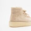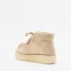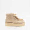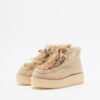 Nan-Ku ankle boots in beige suede with a textured rubber platform sole. Features a fur trim detail on the front and lace-up closure.