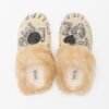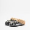Black leather slippers with soft fur detailing. Upper adorned with hand-painted details and glittery appliqués on the front.