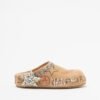 Camel suede flip-flops with fancy appliqués on the sides and hand-painted details.