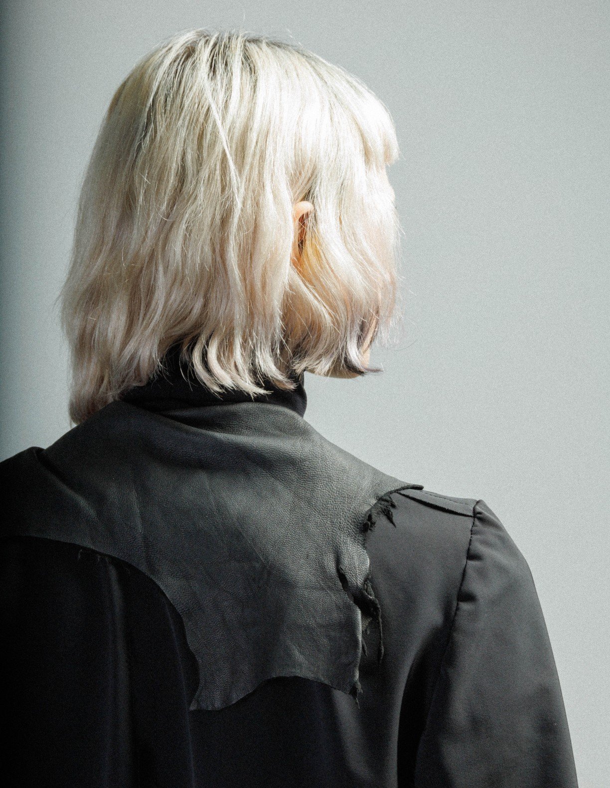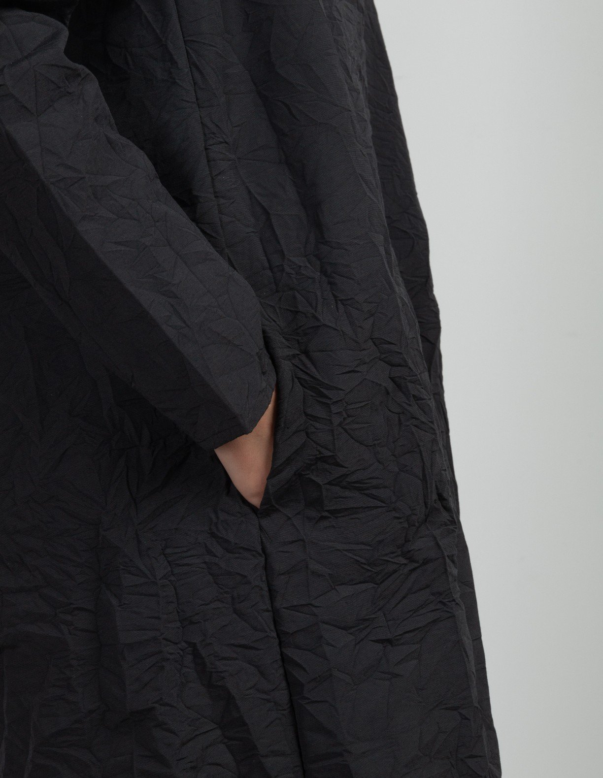 Black coat with a wrinkled effect and lapels. Button closure.