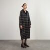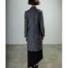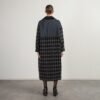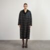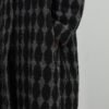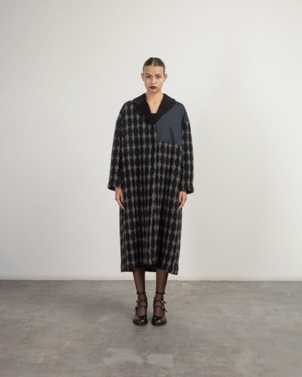Long coat with a black and gray pattern and nylon detail. Features lapels and a snap-button closure.