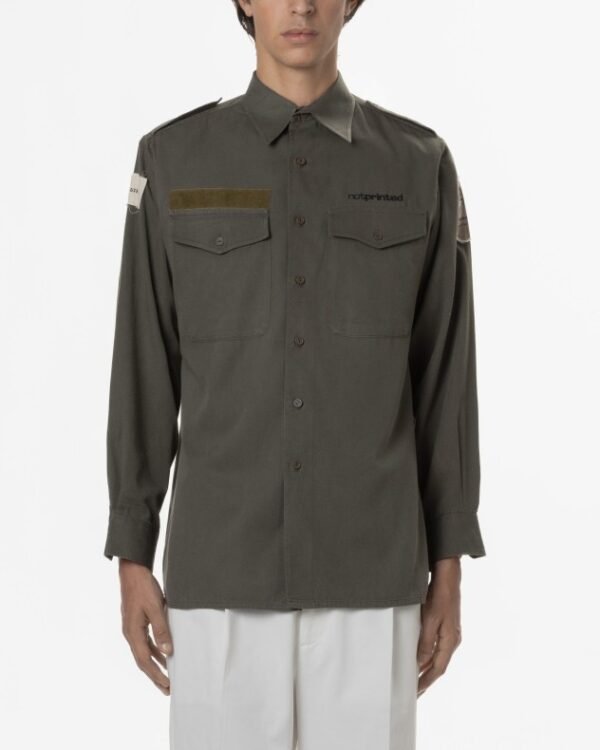 Notprinted green military-style long shirt. Hand-printed Asian print on the back.