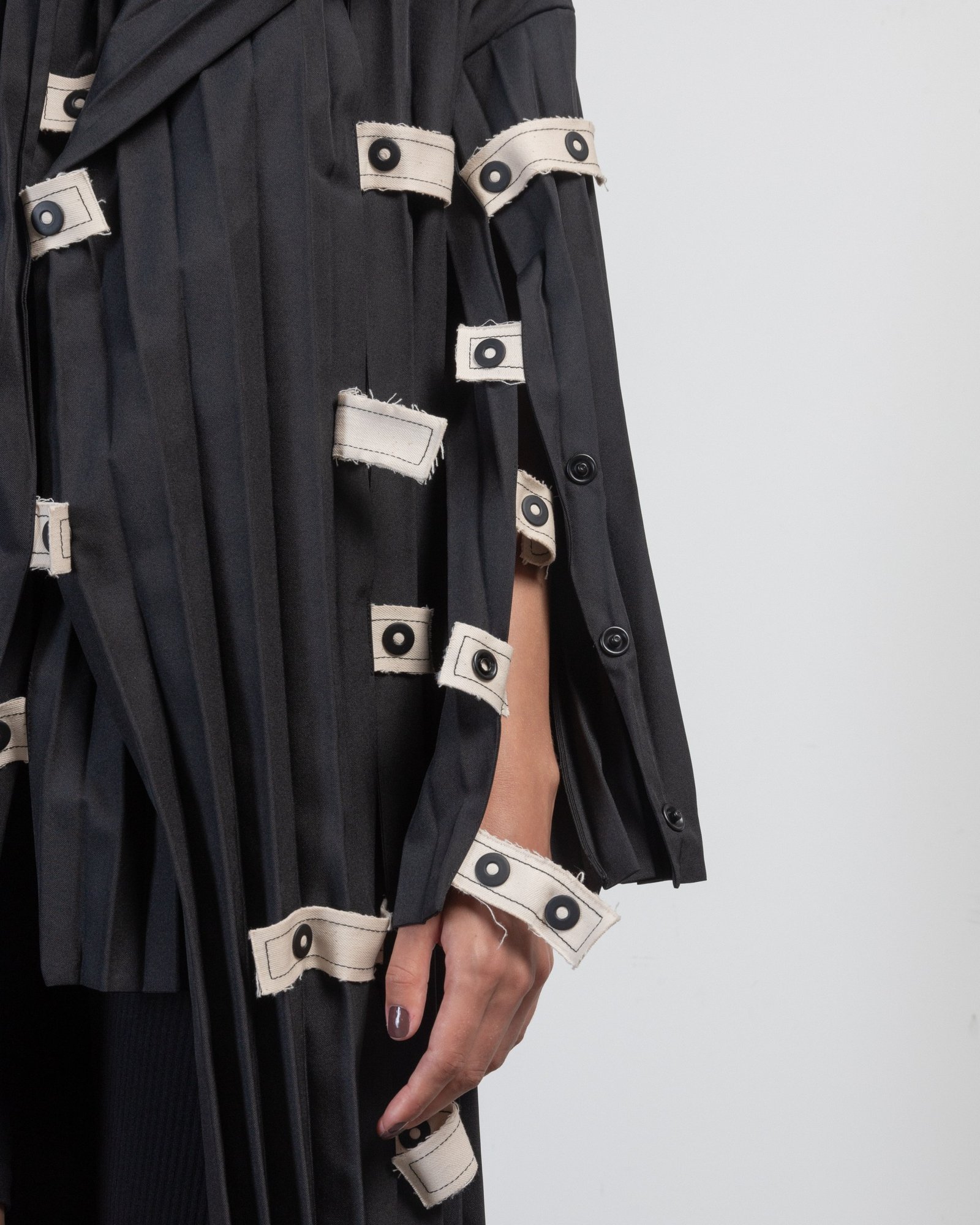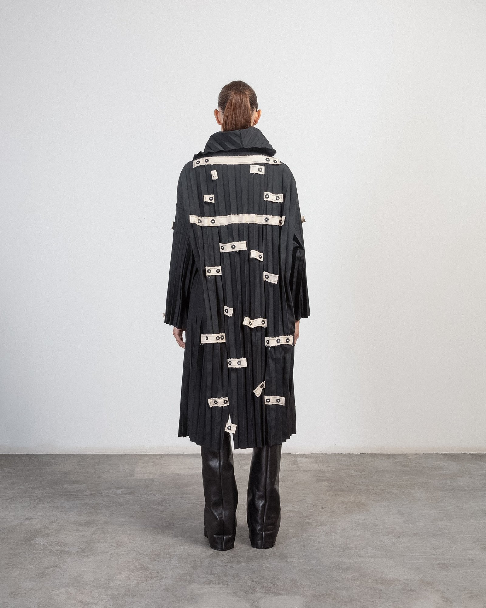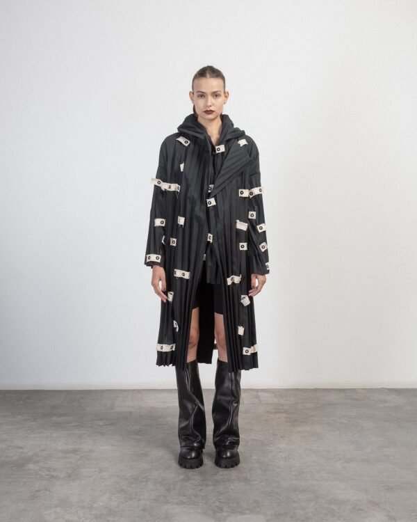Long coat in pleated fabric by NU. Contrasting details with buttons.
