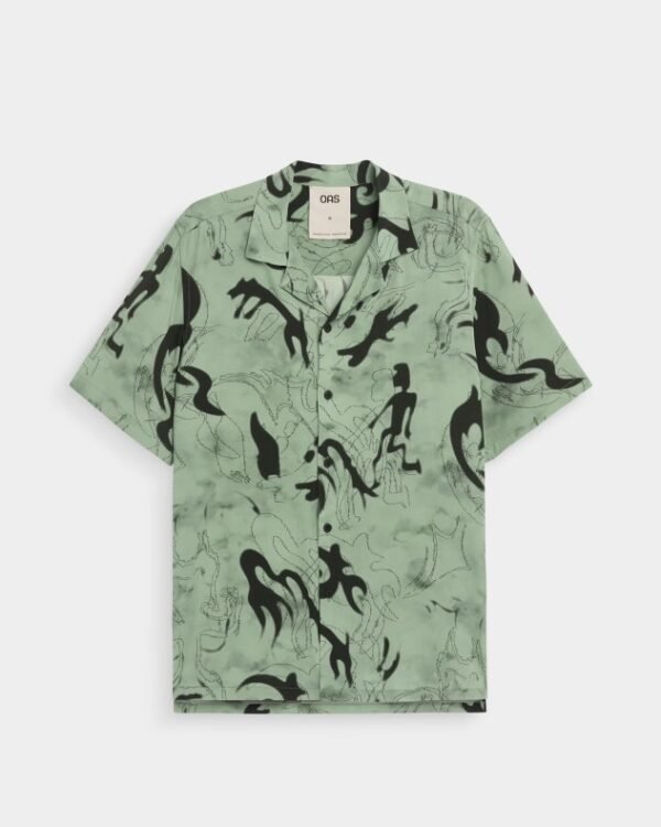 Green short-sleeved viscose shirt featuring a pattern inspired by cave paintings and dreamlike modernist art. A relaxed fit in a silky, breathable fabric.