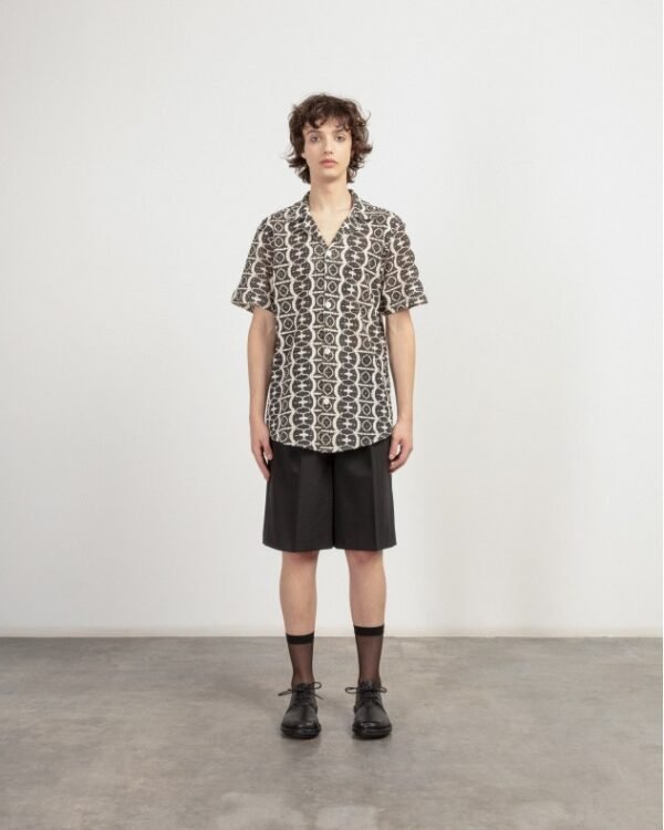 Short-sleeved shirt in cotton fabric, decorated with a print inspired by the mesmerising patterns of snakes. Designed with a resort collar and front buttons.