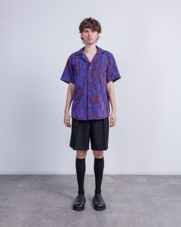 OAS blue short-sleeved shirt for men with two-tone “”Thenards Jiggle Cuba”” pattern. Made from high-quality “toweling” Terry cotton fabric, resulting in a premium finish and unique comfort.